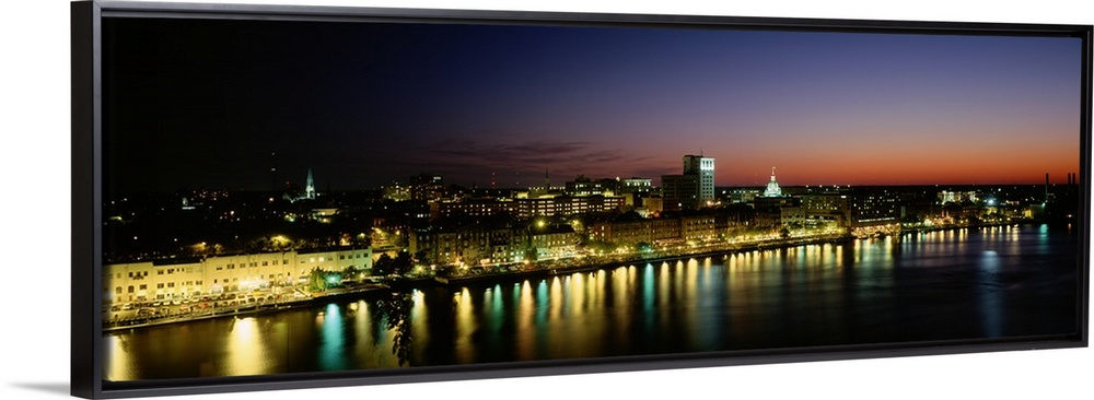 <p>Panoramic photograph of lit up skyline and waterfront at sunset under a colorful sky.</p>