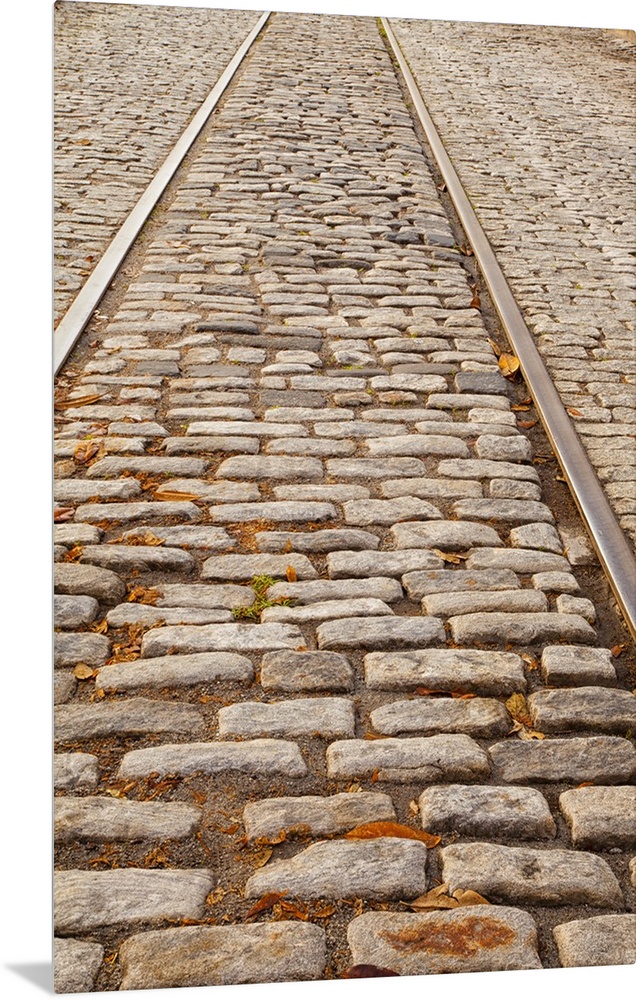 <p>USA, Georgia, Savannah, Old railroad tracks and cobble stones along River Street.</p>