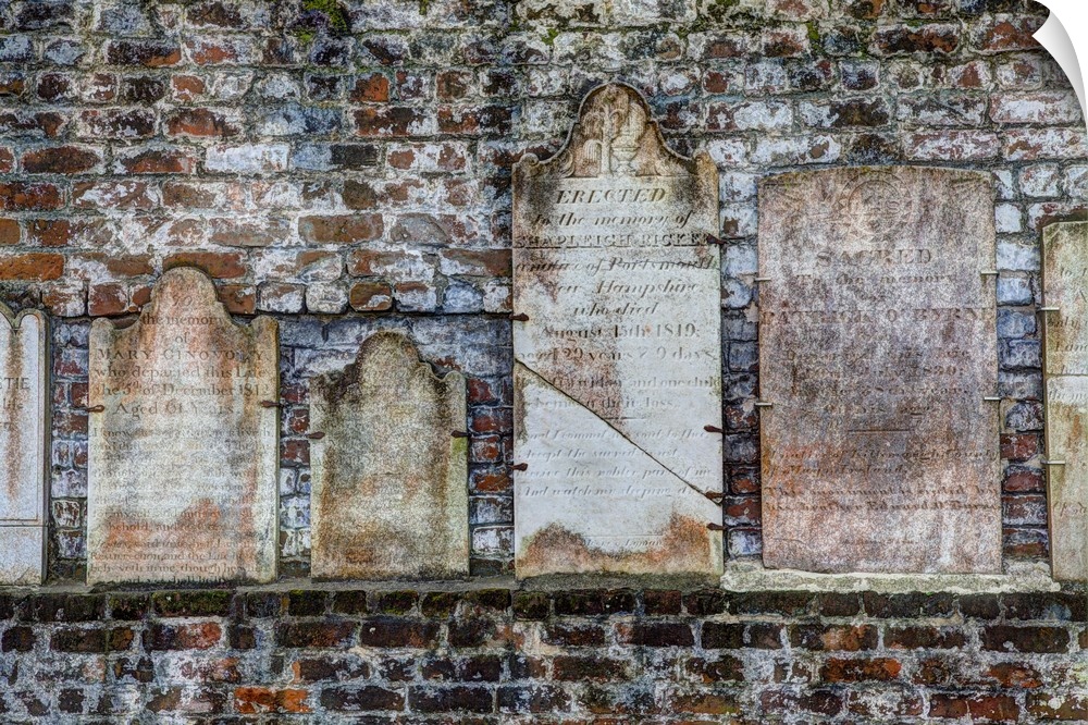 <p>North America, USA, Georgia, Savannah, Tombstones on a wall in Historic Colonial Park Cemetery.</p>