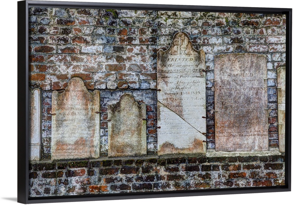 <p>North America, USA, Georgia, Savannah, Tombstones on a wall in Historic Colonial Park Cemetery.</p>