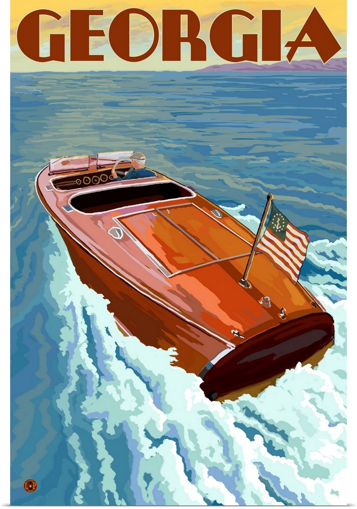 <p>Retro stylized art poster of a wooden speed boat on the water.</p>