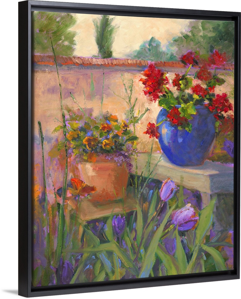 <p>Still life painting of two potted flowers on benches in a walled garden.</p>