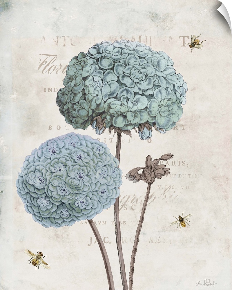 <p>Vintage illustration of blue geraniums and bumble bees with faded text on the background.</p>