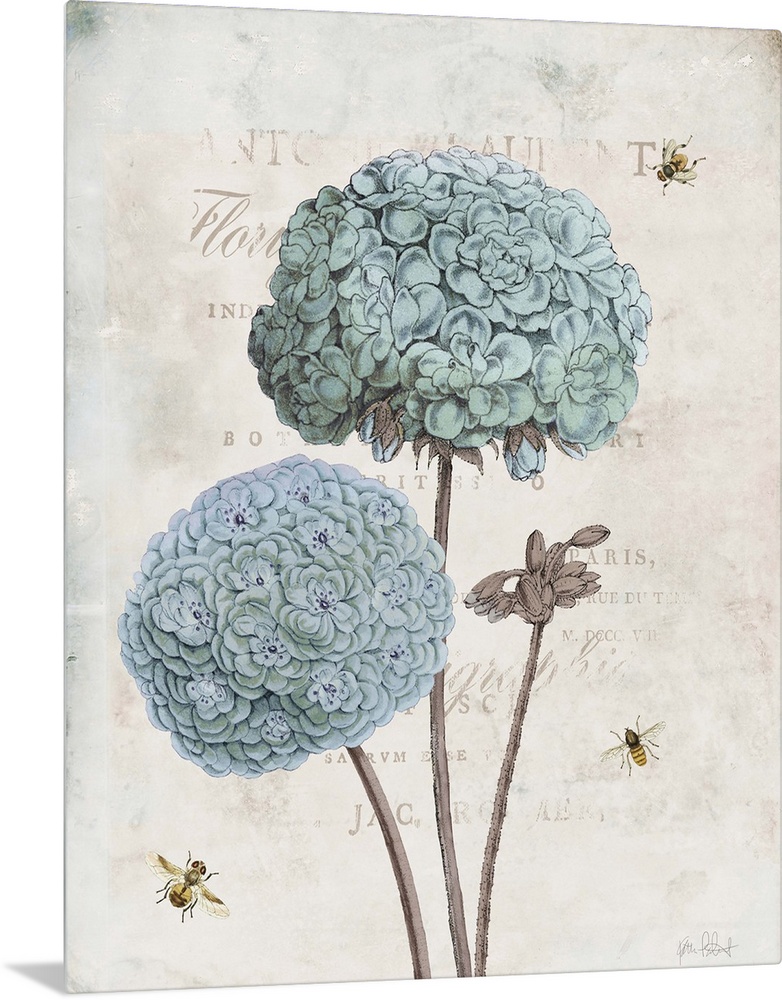 <p>Vintage illustration of blue geraniums and bumble bees with faded text on the background.</p>