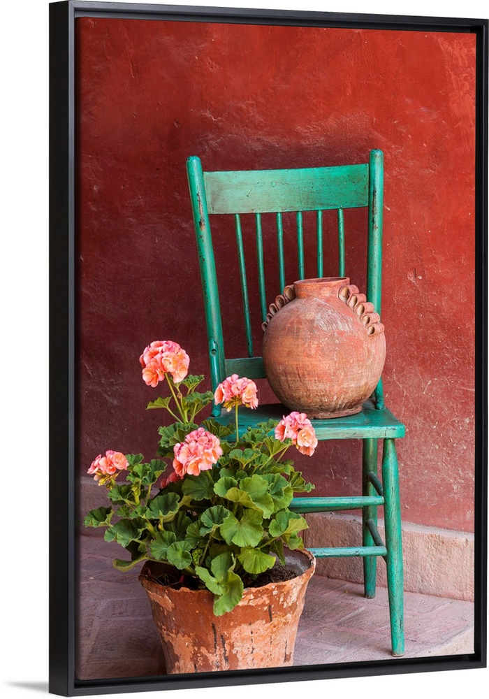 <p>Mexico, San Miguel de Allende. Geraniums, flowerpots and chair decorate an entrance.</p>