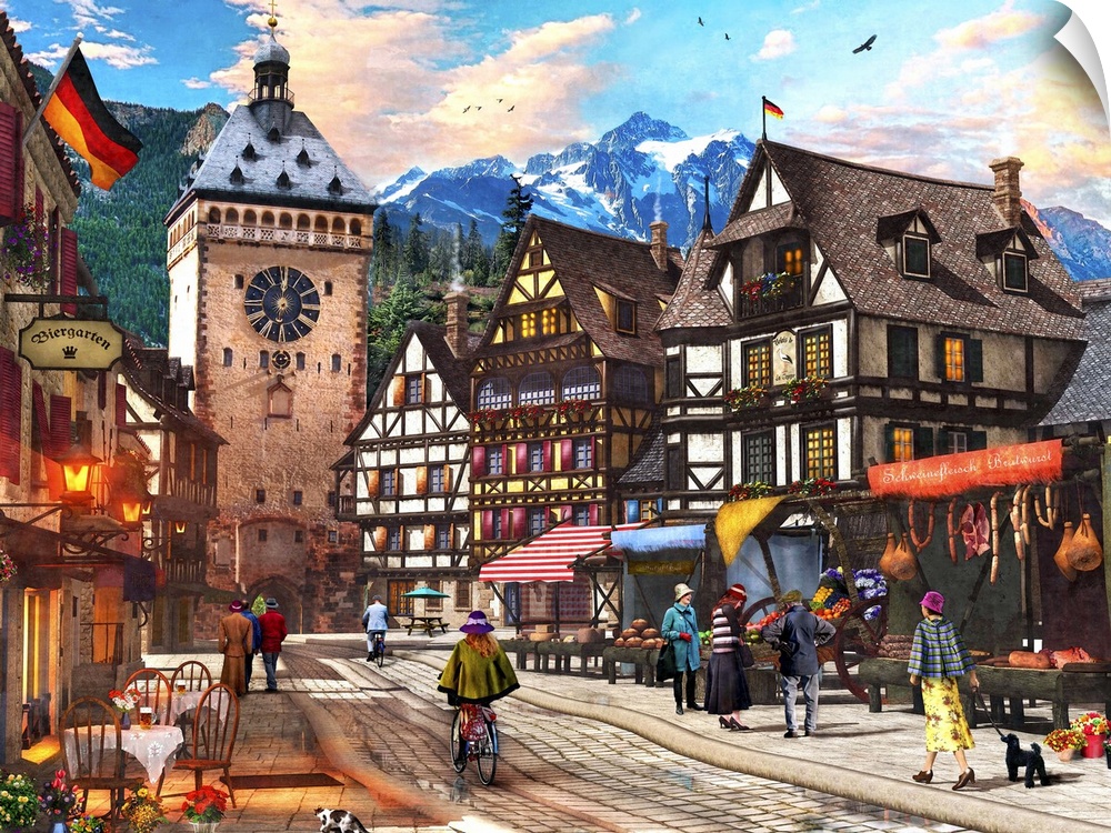 <p>Illustration of a market town somewhere in the Alps.</p>