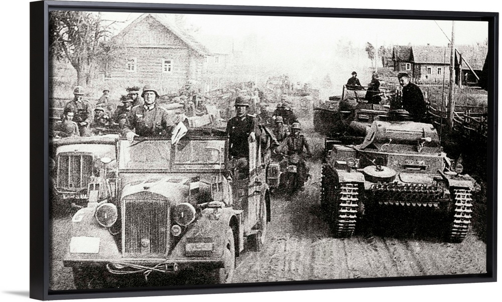 <p>German military convoy in occupied Russia during World War II. Kfz15 Horch Utility Car and PzKpfwIIc, Panzer II light tank passing through a village. At the sides of the road are the typical wooden houses of a Russian village.</p>