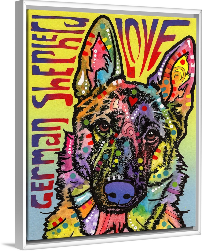 <p>"German Shepherd Love" written around a colorful painting of a German Shepherd with abstract markings on a yellow and blue background.</p>