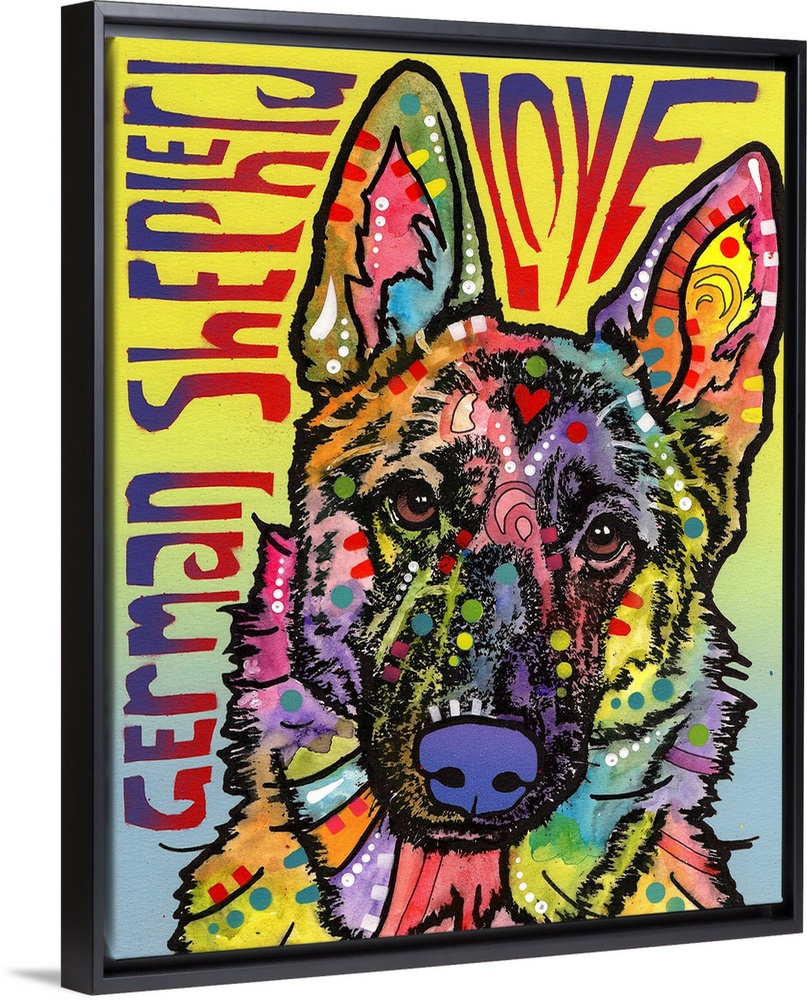 <p>"German Shepherd Love" written around a colorful painting of a German Shepherd with abstract markings on a yellow and blue background.</p>