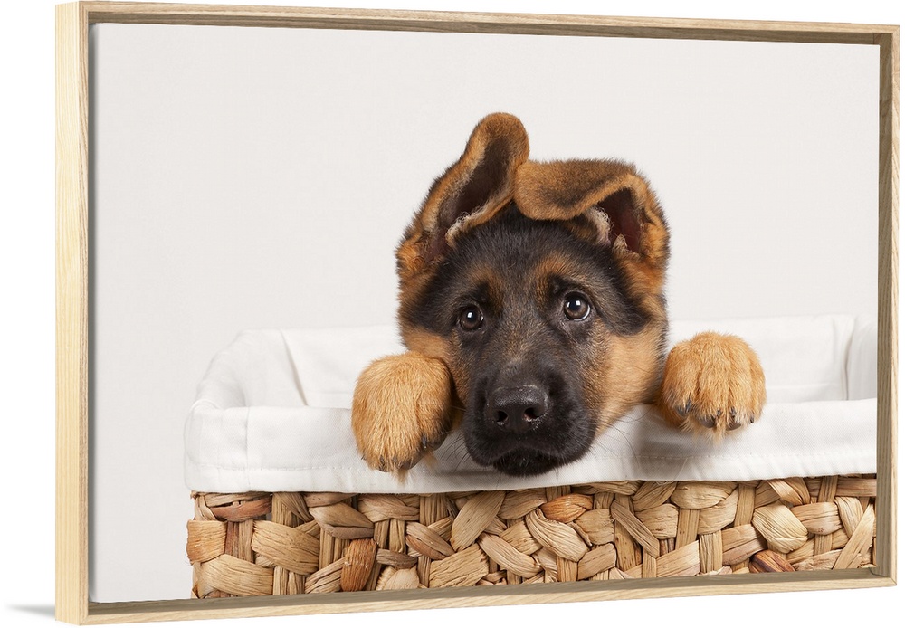 <p>German shepherd puppy in basket.</p>