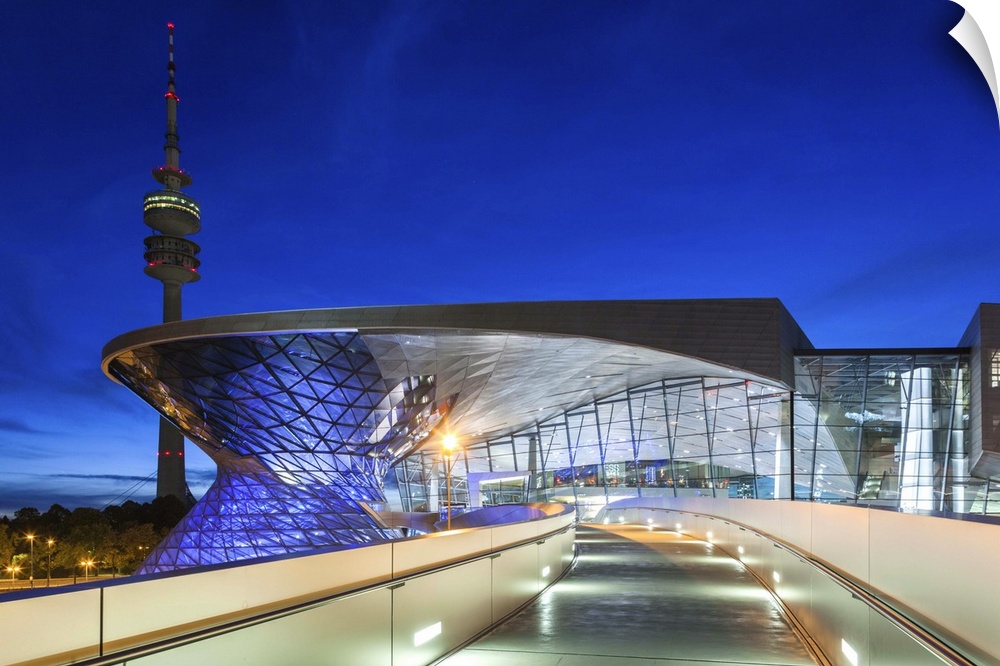 <p>Germany, Bavaria, Munich, BMW Welt company showroom and Olympia Tower, dusk.</p>