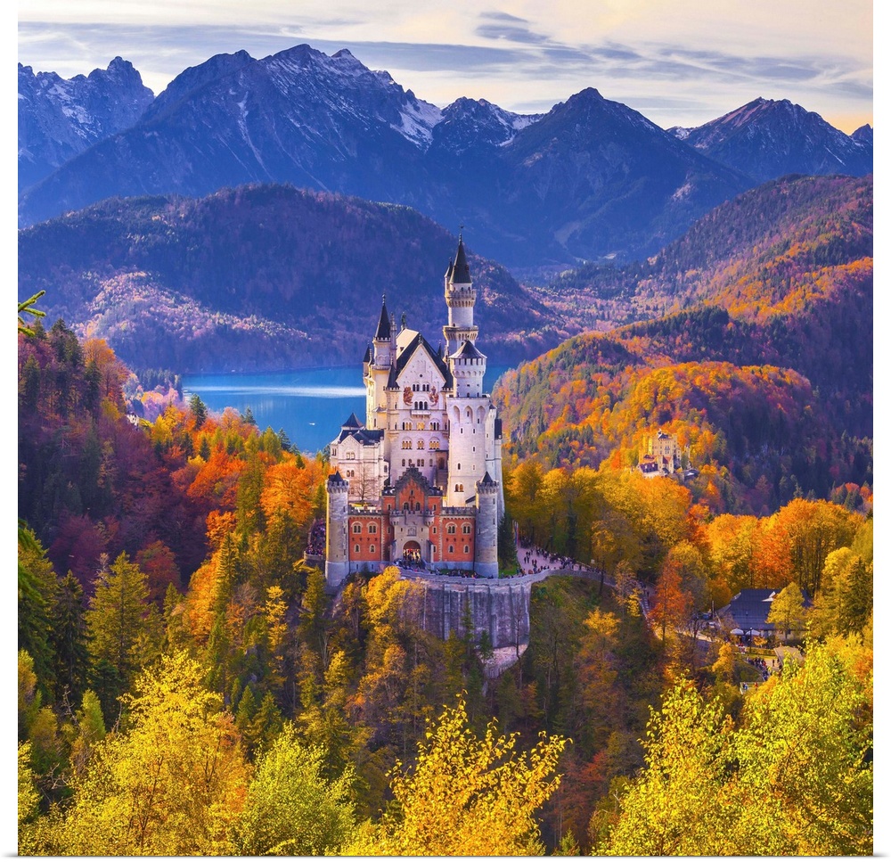 <p>Germany, Bavaria, Swabia, Swabia, Neuschwanstein Castle and Hohenschwangau Castle with Lake Alpsee and Tannheim Mountains</p>