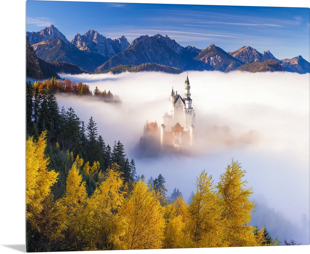 <p>Germany, Bavaria, Swabia, Neuschwanstein Castle in the fog, Tannheim Mountains in background</p>