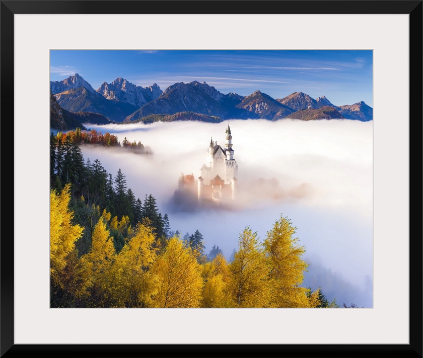 <p>Germany, Bavaria, Swabia, Neuschwanstein Castle in the fog, Tannheim Mountains in background</p>