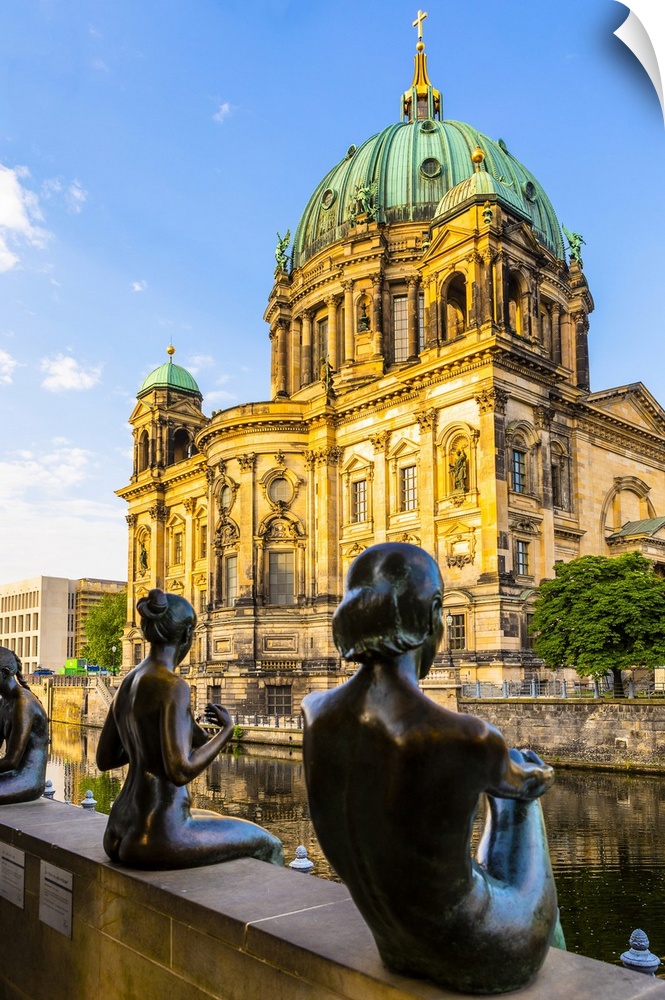 <p>Germany, Berlin, Berlin Mitte, Berlin Cathedral, Berlin Cathedral on Spree River with Three Girls and a Boy sculptures in the foreground</p>