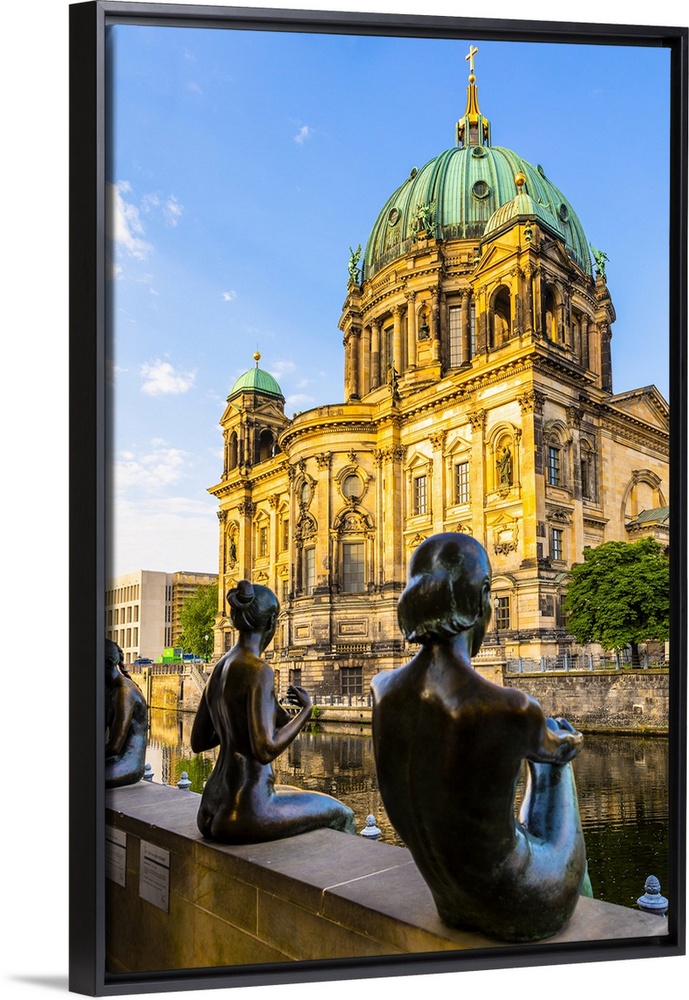<p>Germany, Berlin, Berlin Mitte, Berlin Cathedral, Berlin Cathedral on Spree River with Three Girls and a Boy sculptures in the foreground</p>