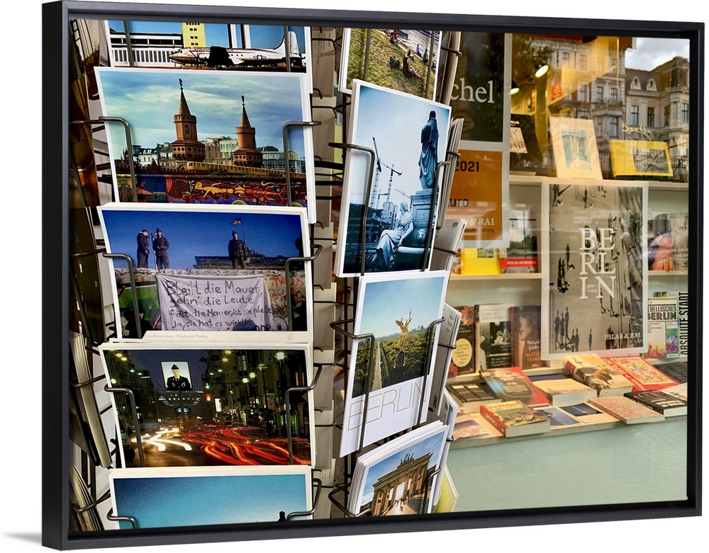 <p>Germany, Berlin. Postcards rack outside a local bookstore.</p>
