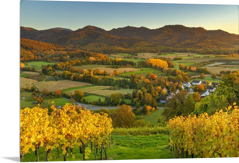 <p>Germany, Baden-Wurttemberg, Black Forest, Ehrenkirchen, Markgraflerland, Vineyards in autumn near Ehrenstetten, part of Ehrenkirchen.</p>