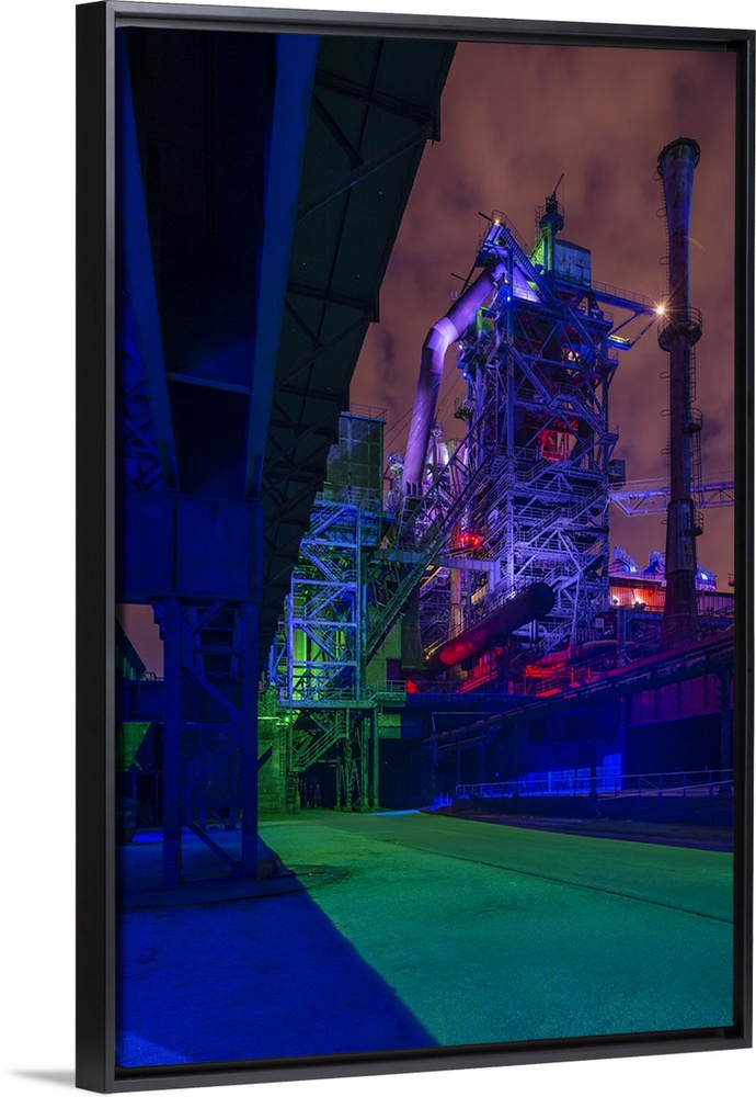 <p>Germany, North Rhine-Westphalia, Ruhr Area, Duisburg, Blast Furnace 5 complex illuminated at night, North Duisburg Landscape Park.</p>