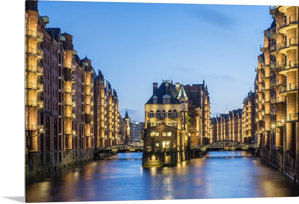 <p>Germany, Hamburg, Speicherstadt. Historic Wasserschloss at dusk, view from the Poggenmuhlenbrucke.</p>