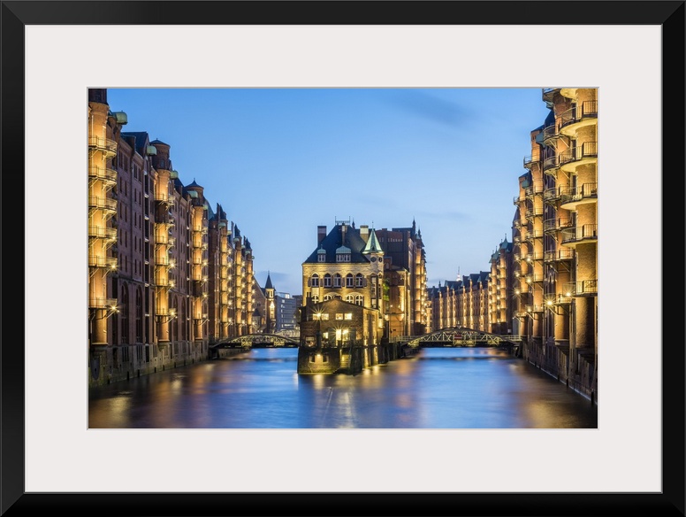 <p>Germany, Hamburg, Speicherstadt. Historic Wasserschloss at dusk, view from the Poggenmuhlenbrucke.</p>