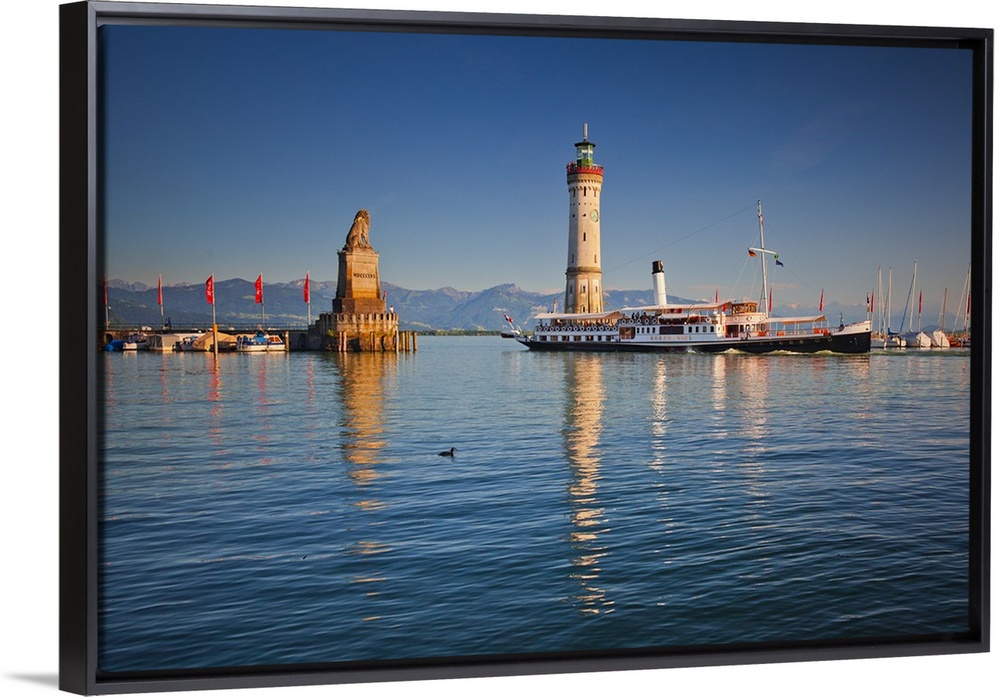 <p>Germany, Bavaria, Lake Constance, Swabia, Schwaben, Lindau, Lighthouse and a passenger ship at the harbor entrance at sunset.</p>