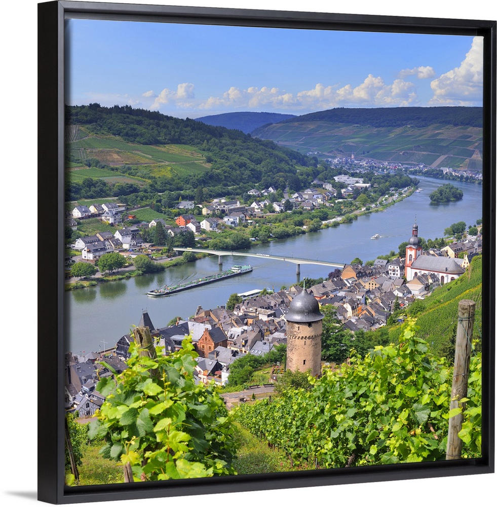 <p>Germany, Rhineland-Palatinate, Moselle Valley, Moselle Wine Route, Zell an der Mosel, Moselle River and typical vineyards.</p>