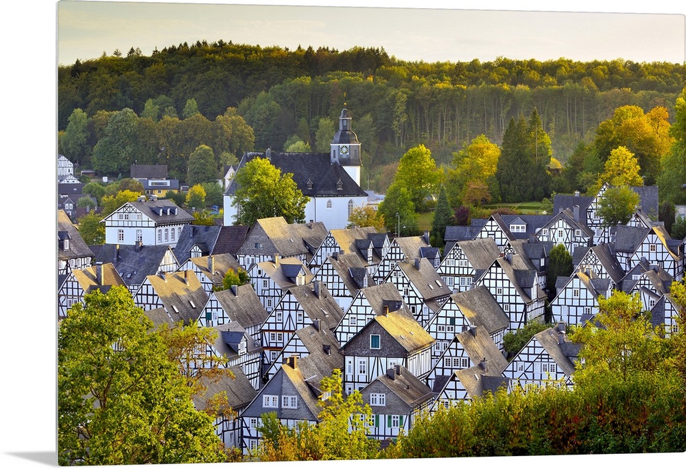 <p>Germany, North Rhine-Westphalia, Siegerland, Freudenberg, Alter Flecken and Evangelische Kirche seen from Kurpark.</p>