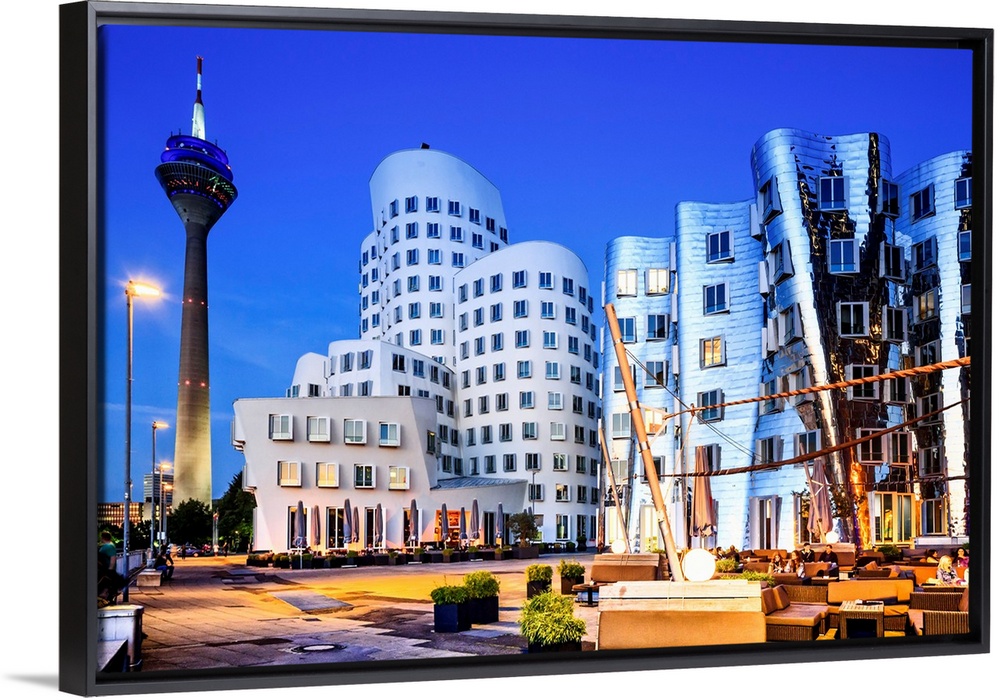 <p>Germany, North Rhine-Westphalia, Dusseldorf, Neuer Zollhof by Frank Gehry in Dusseldorf Media harbor.</p>