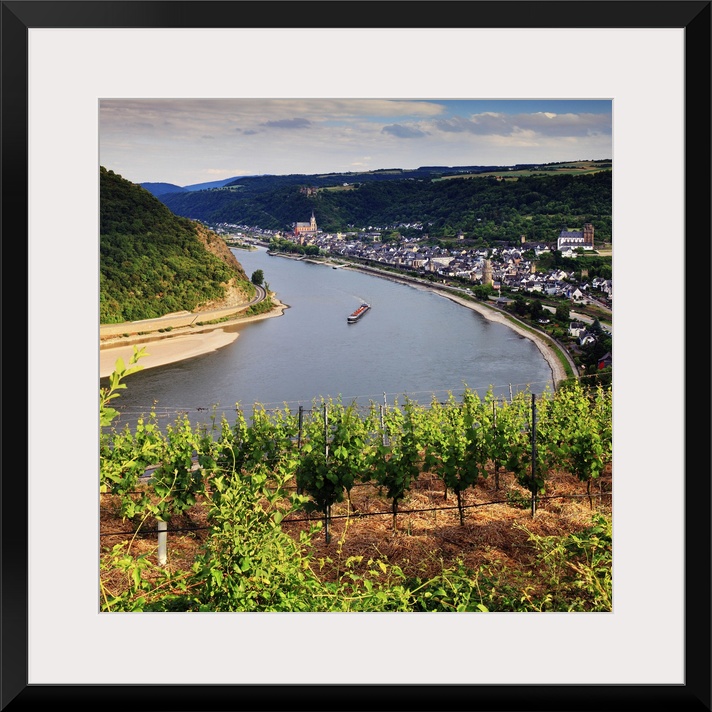 <p>Germany, Deutschland, Rhineland-Palatinate, Rheinland-Pfalz, Rhine, Central Europe, Rhine valley, Oberwesel, View of the village on the Rhine river with its three landmarks, Sankt Martins Kirche (White church), Liebfrauenkirche (Red church) and Schonburg castle</p>