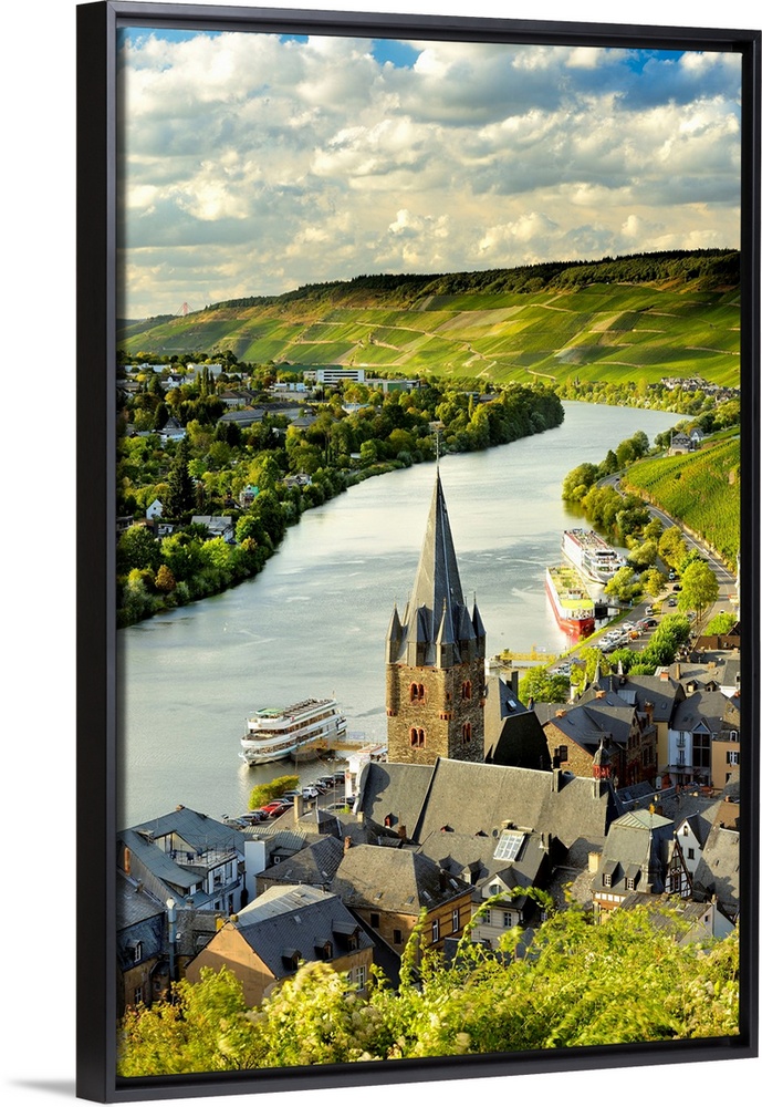 <p>Germany, Rhineland-Palatinate, Bernkastel-Kues, Saxon Wine Route, View over Bernkastel-Kues and surrounding vineyards along the Moselle river and German vine road (weinstrasse).</p>