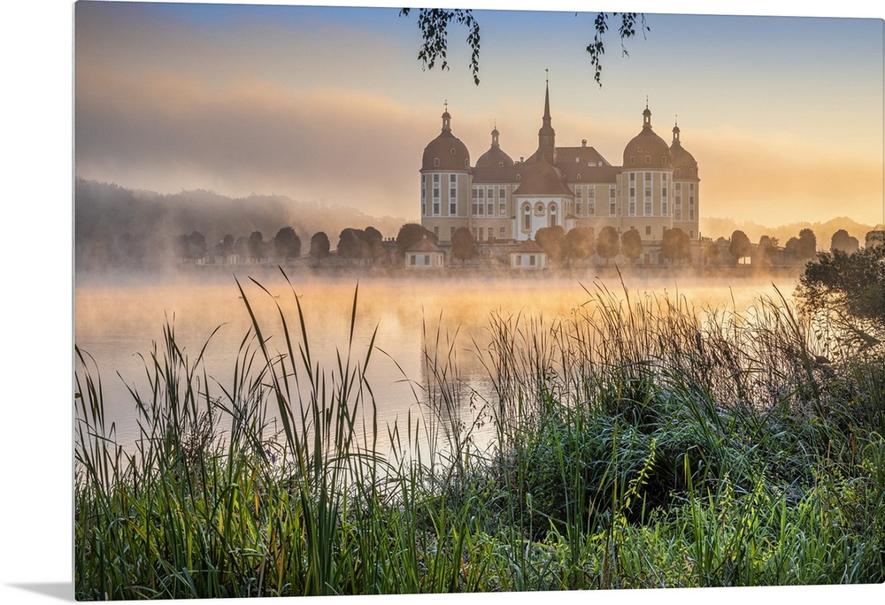 <p>Germany, Saxony, Moritzburg, Moritzburg Castle, Morning mood at the castle pond with the baroque castle near Dresden.</p>