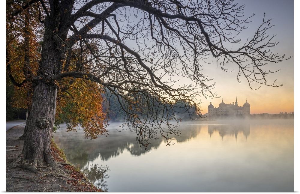 <p>Germany, Saxony, Moritzburg, Moritzburg Castle, Morning mood at the castle pond with the baroque castle near Dresden.</p>