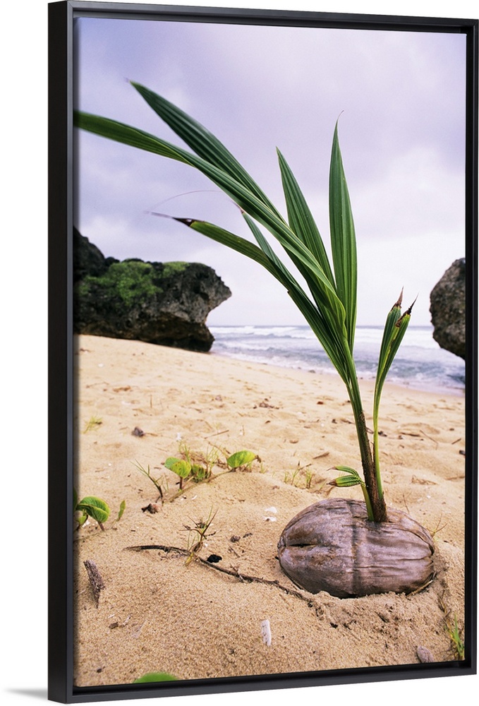 <p>Germinating coconut palm (Cocos nucifera) on a beach in Barbados. A coconut palm can grow up to 30 metres high and will begin to bear fruit (coconuts) roughly 7 years after germination. Coconuts take between 8 to 10 months to fully ripen. Young, green coconuts contain a nutritious liquid, rich in vitamin C, and a soft, jelly-like flesh, while ripened fruit conatin a thicker liquid (milk) and white, solid flesh that is used in cooking rather than eaten raw.</p>
