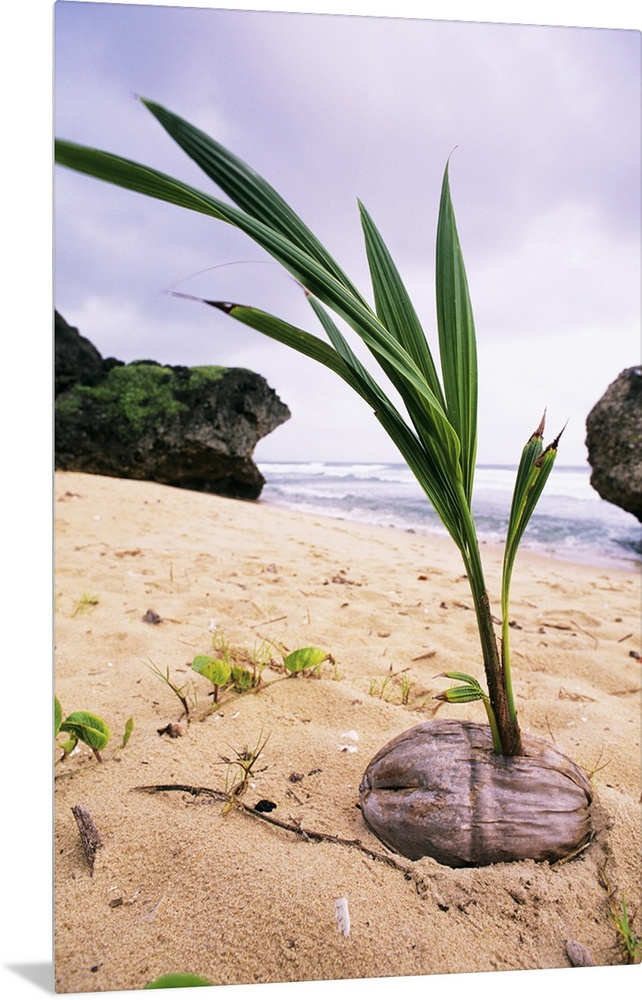 <p>Germinating coconut palm (Cocos nucifera) on a beach in Barbados. A coconut palm can grow up to 30 metres high and will begin to bear fruit (coconuts) roughly 7 years after germination. Coconuts take between 8 to 10 months to fully ripen. Young, green coconuts contain a nutritious liquid, rich in vitamin C, and a soft, jelly-like flesh, while ripened fruit conatin a thicker liquid (milk) and white, solid flesh that is used in cooking rather than eaten raw.</p>