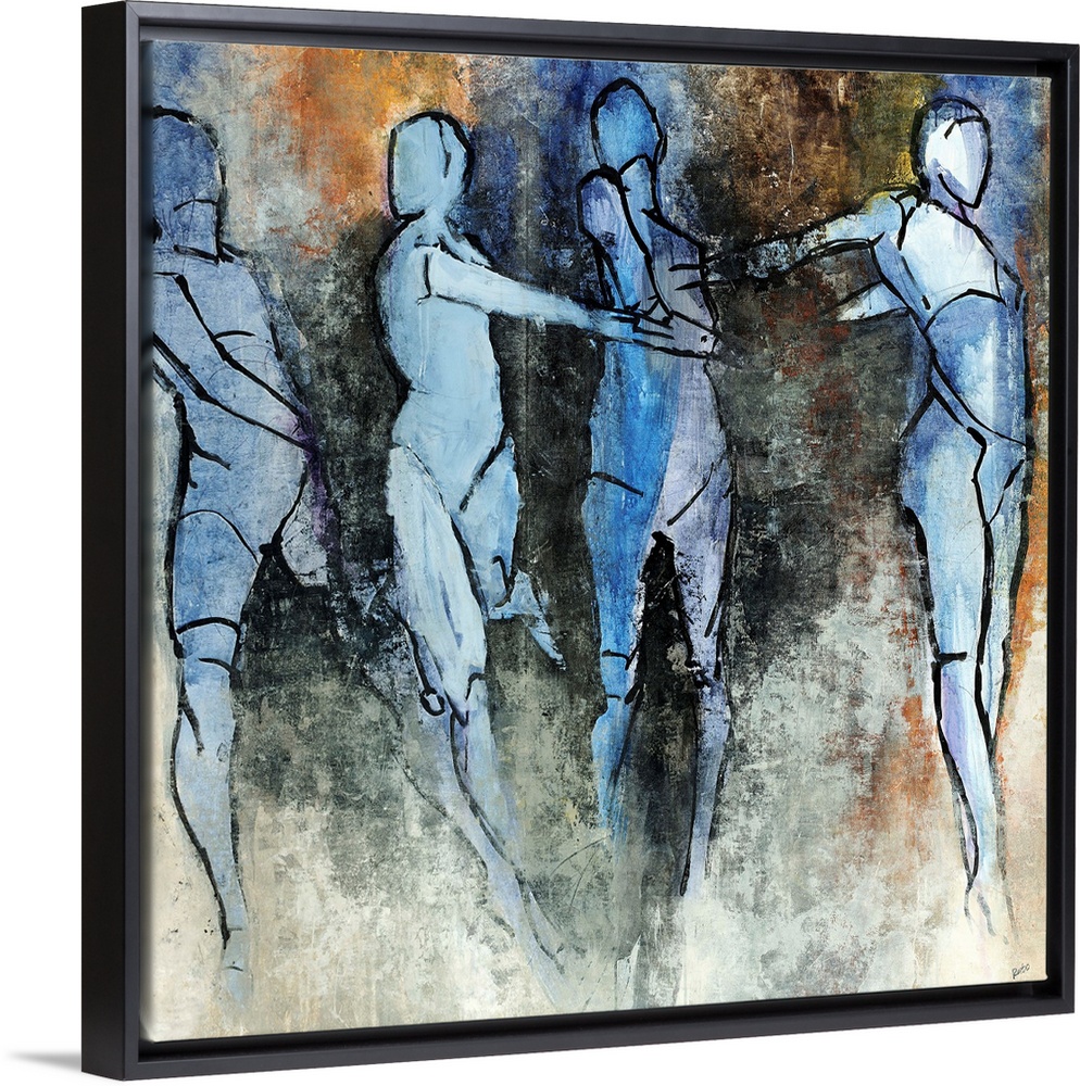 <p>Contemporary painting of four different versions of the basic human form in movement, on a multicolored background with the appearance of watercolor painting.</p>