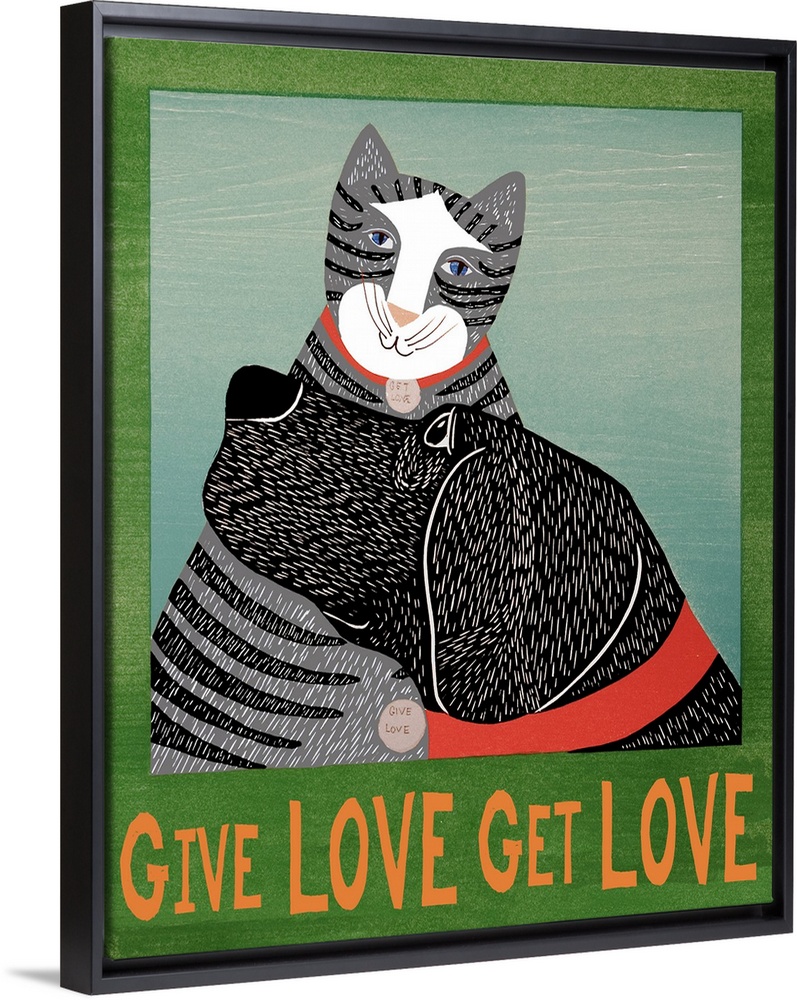 <p>Illustration of a cat and dog snuggling each other with the phrase "Give Love Get Love" written on the bottom and on their tags.</p>