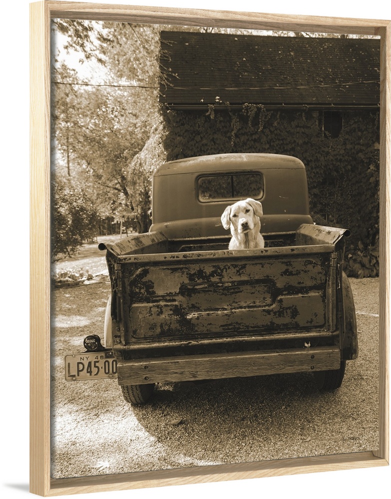 <p>A sepia toned photograph of a dog sitting in the back of a vintage truck at a farm.</p>