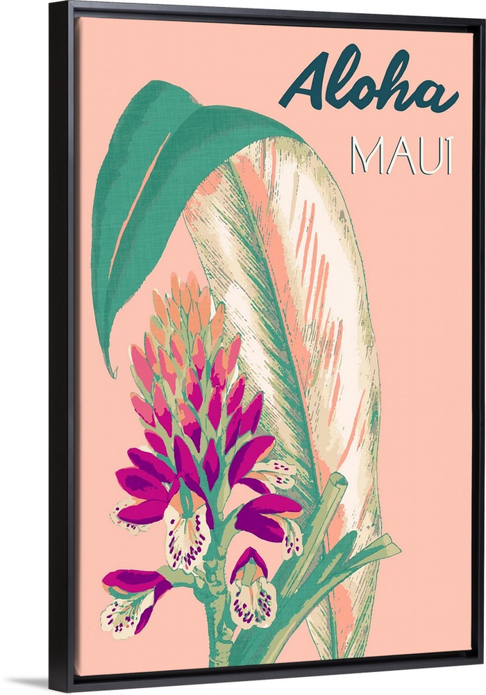<p>Bright contemporary floral painting with text, "Aloha Maui."</p>