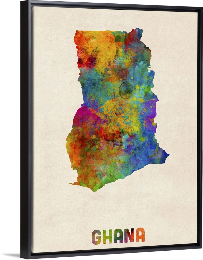 <p>Colorful watercolor art map of Ghana against a distressed background.</p>