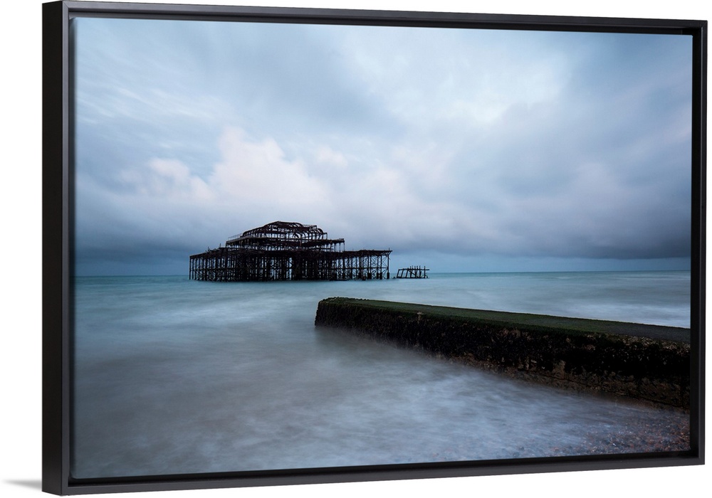 <p>A cool blue dramatic storm image of Brighton Pier, Sussex, UK with the Old Pier in stormy seas and a concrete jetty in the foreground.</p>