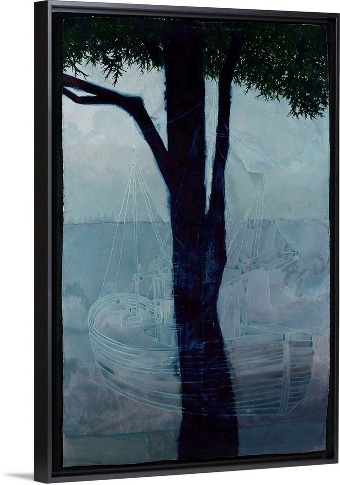 <p>Contemporary watercolor painting of a faint ship overlay with the image of a tree.</p>