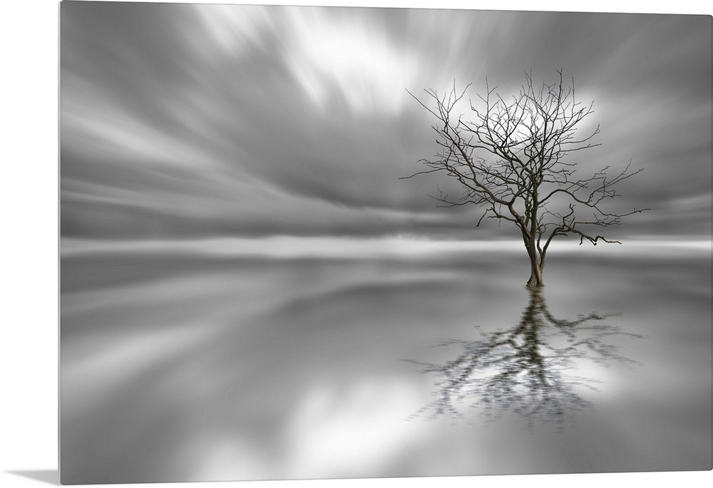 <p>A lone tree stands strong in a still watery landscape casting mirror-like reflection.</p>