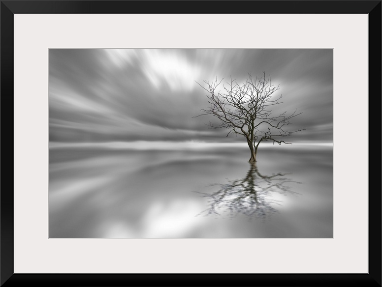 <p>A lone tree stands strong in a still watery landscape casting mirror-like reflection.</p>