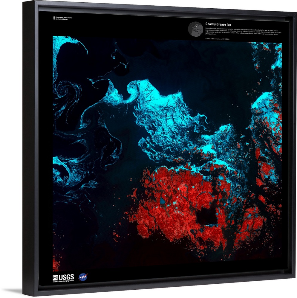 <p>Ethereal swirls of grease ice appear turquoise against the midnight blue of the northern Baltic Sea near the Aland Islands (red) between Finland and Sweden. An early stage of sea ice formation, grease ice consists of a viscous mix of tiny ice crystals and resembles an oil slick on the ocean's surface. Wind and currents constantly shape and reshape grease ice into surreal, ghostly patterns. April 19, 2003.</p>