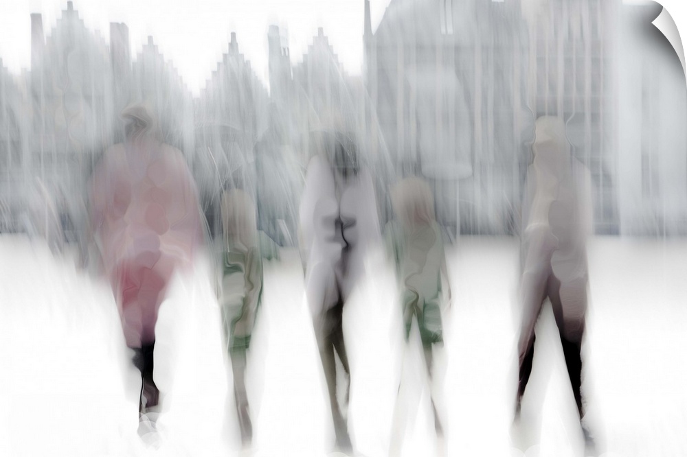 <p>Abstract image of five figures walking in a city street, with blurred motion and altered colors.</p>
