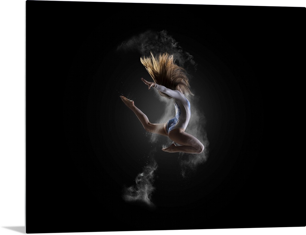 <p>A gymnast leaps into the air, with white powder around her.</p>
