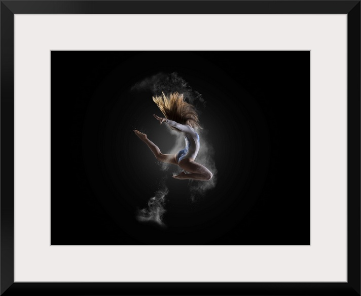 <p>A gymnast leaps into the air, with white powder around her.</p>