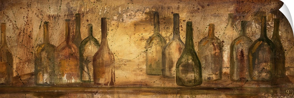 <p>Wide neutral colored painting of wine bottles on a table with a paint splatter overlay.</p>
