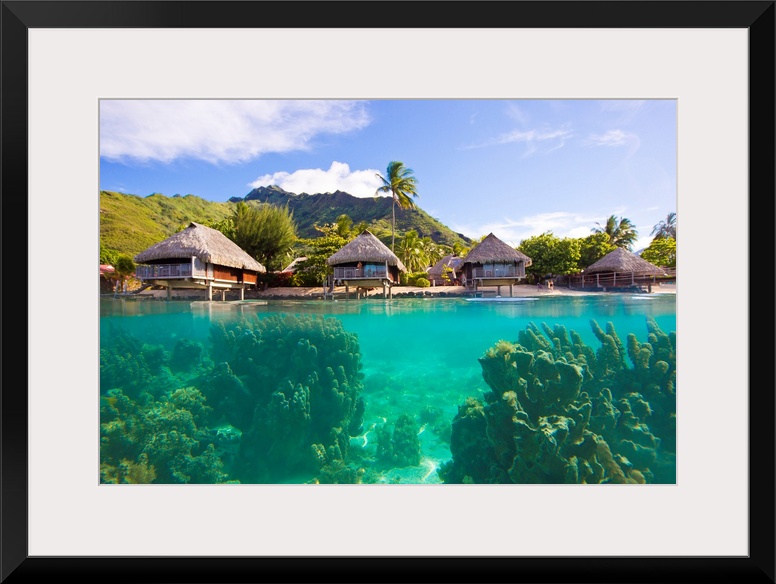 <p>Giant coral heads just offshore of a resort with over-water bungalows.</p>
